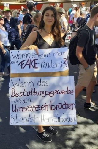 Hier eine Junge Frau, die ein globales Infektionsgeschehen (Pandemie) auf einige wenige deutsche auswirkungen reduziert und damit fälschlicherweise / verfälschenderweise den globalen Charakter völlig verkennt / ignoriert.