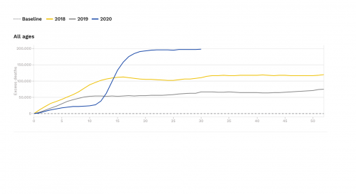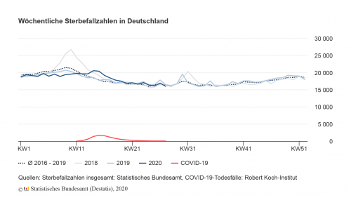 Es kommt überhaupt nicht auf die Höhe eines Peaks an, sondern am Ende des Jahres auf die Fläche unterhalb der Kurve (Integral über die Kurve) an und zwar auch wieder von 0 beginnend. Dann werden die Unterschiede zwischen den Jahren voraussichtlich sehr klein sein. Allerdings wissen wir noch nicht wie viele Sterbefälle im 2. Hj. aufgrund des Lockdowns kommen werden: Tote durch nicht rechtzeitig durchgeführte Operationen, Suizide.