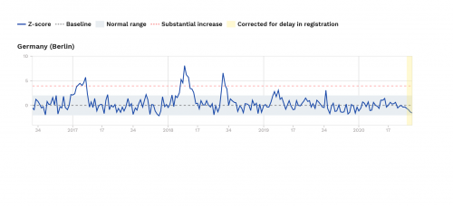 Im Euromomo-Bild zu Berlin ist keine Übersterblichkeit zu erkennen. (Hier gibt es leider nur eine Grafik mit Z-Score, nicht mit den absoluten Zahlen.)