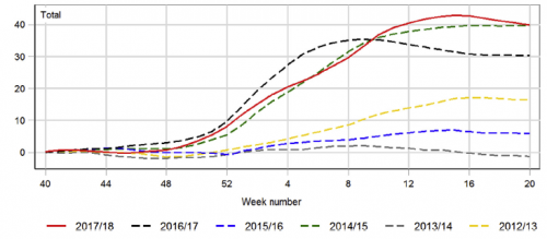 Das ist für Euromomo eigentlich untypisch. Wenn wir mal auf die Seite How it Works\Reports & Publications von Euromomo wechseln und uns den ersten Bericht ansehen, dann finden wir darin ganz ähnliche Bilder, sie beginnen aber mit KW 40 des Vorjahres, hier mal ein Ausschnitt: