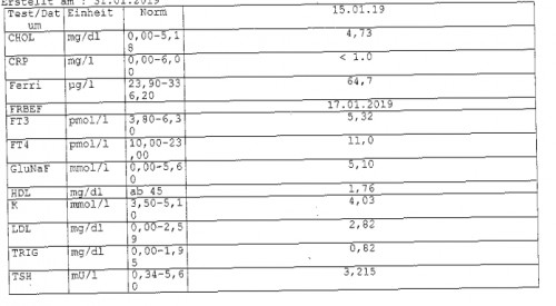 Aktuell habe ich eine Heilpraktikerin gefunden bei dieser hatte ich vorige Woche meinen Vorstellungstermin und diese möchte sich die UnterlagenBlutwerte genauer anschauen um den weiteren Weg zu besprechen.
