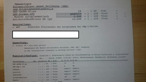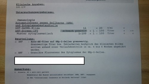 Nun konnte ich meinen HA dazu überreden Aufgrund meines Verdachtes die Blutwerte mal auf Lupus zu testen. Siehe da, der HA war sehr überrascht (Abstand der Messungen 6 Wochen) . Da sich der HA der beiden Ergebnisse unsicher war hat dieser Rücksprache mit dem Labor gehalten. Das Ergebnis hat mich etwas verunsichert (nicht Behandlungsbedürftig) .
