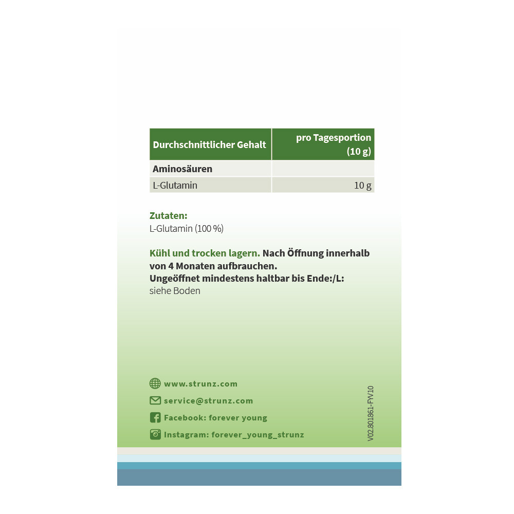 forever young L-Glutamin ist ein Nahrungsergänzungsmittel in Pulverform aus reinem L-Glutamin, gewonnen aus Fermentation.
