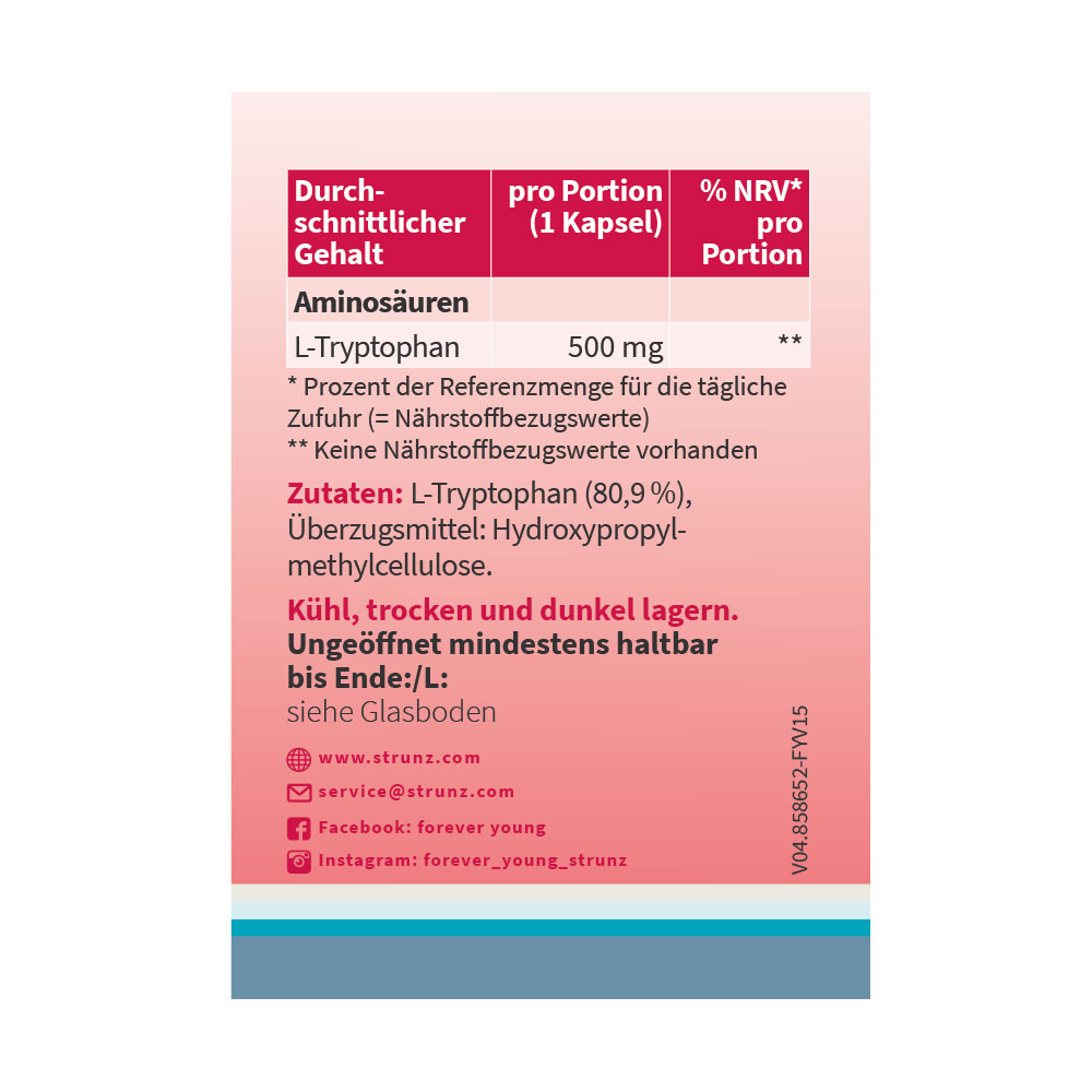 - forever young L-Tryptophan: Dieses Produkt enthält nur die Aminosäure Tryptophan 500 mg hochkonzentriert.