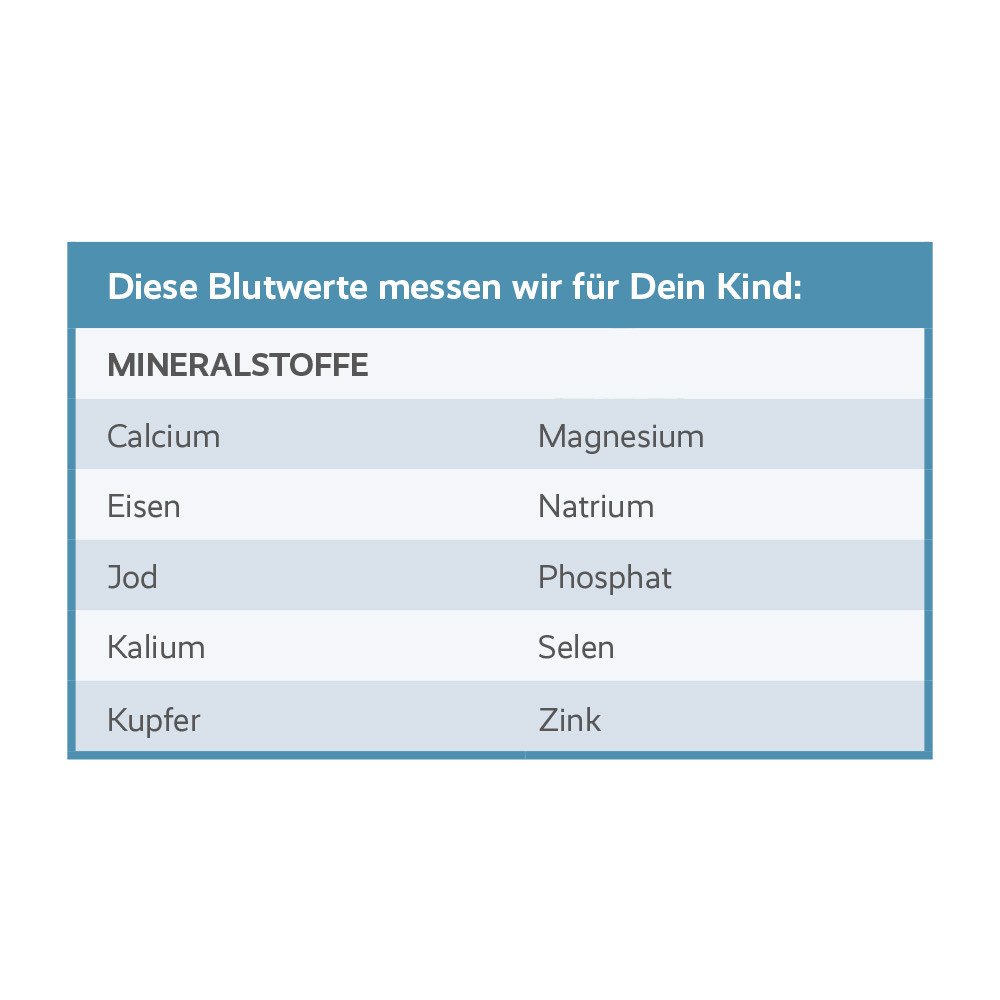 Der for you mineralstoff test kids bestimmt 10 relevante Mineralstoffe und Spurenelemente, welche wichtig für Entwicklung und das Wohlbefinden Ihres Kindes sind. Lebensfreude, Energielevel und Aufnahmefähigkeit werden maßgeblich von der Mineralstoff-Versorgung mit beeinflusst. Deshalb ist es wichtig, Ihrem Kind über eine ausgewogene Ernährung, alle relevanten Nährstoffe zur Verfügung zu stellen.