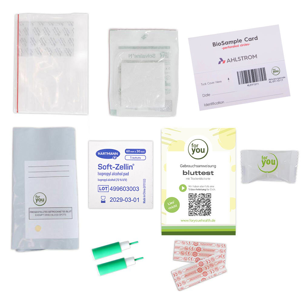 Der for you nahrungsmittelunverträglichkeits test ist ein Trockenbluttest zur Bestimmung von Nahrungsmittelunverträglichkeiten. Es lassen sich die Reaktionen auf 38 Nahrungsmittel, sowie das Gesamt-IgE bestimmen.