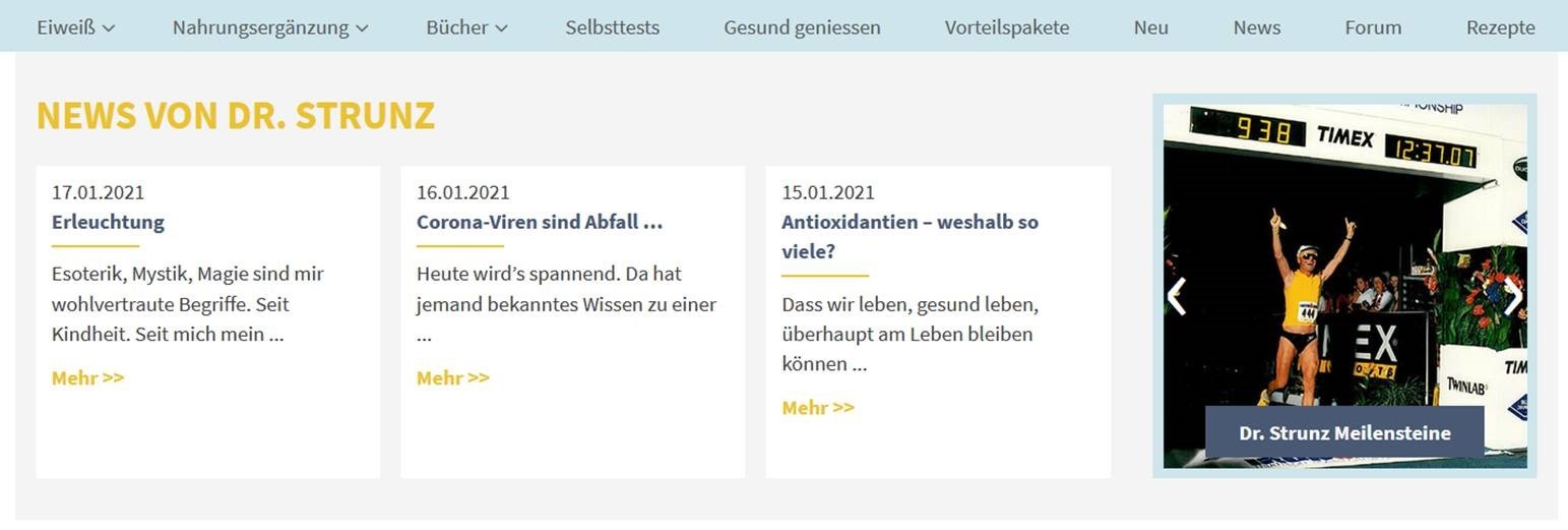 Je nachdem mit welchem Gerät Sie strunz.com besuchen, klicken Sie entweder rechts neben den bekannten News auf die dunkelblauen Kästen, z.B. Dr. Strunz Meilensteine. Wenn Sie über Ihr Mobiltelefon die Webseite aufrufen, finden Sie das Bild gleich am Anfang vor – einfach draufdrücken und die Dr. Strunz Geschichte und weitere Inhalte über den neuen „Slider“ erkunden.