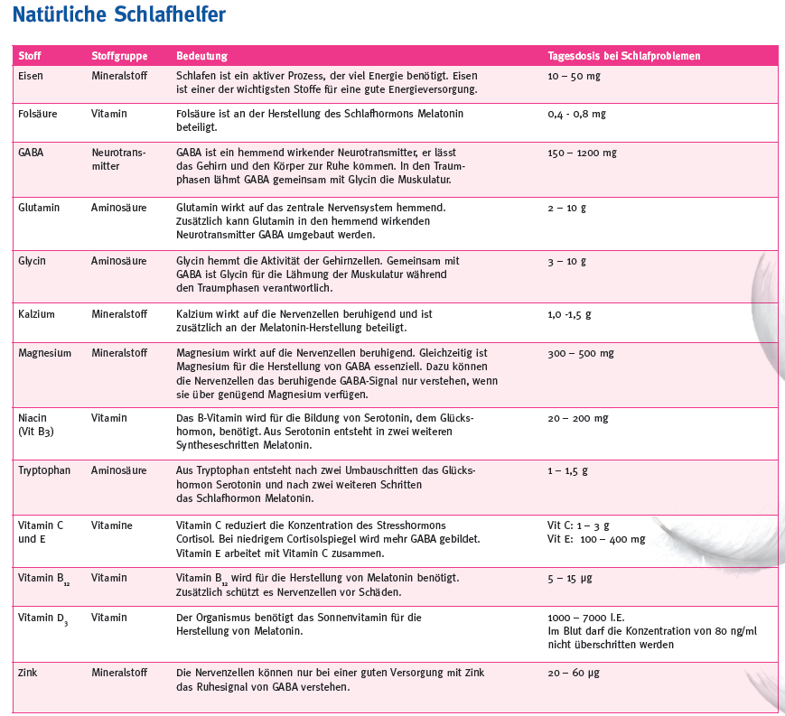 - sondern, wieder einmal, Mutter Natur. Essentielle „Schlaf“-Stoffe. Weshalb im Falle eines Falles nicht einfach ausprobieren? Eine ganze Tabelle von Möglichkeiten haben wir Ihnen einmal zusammengestellt.