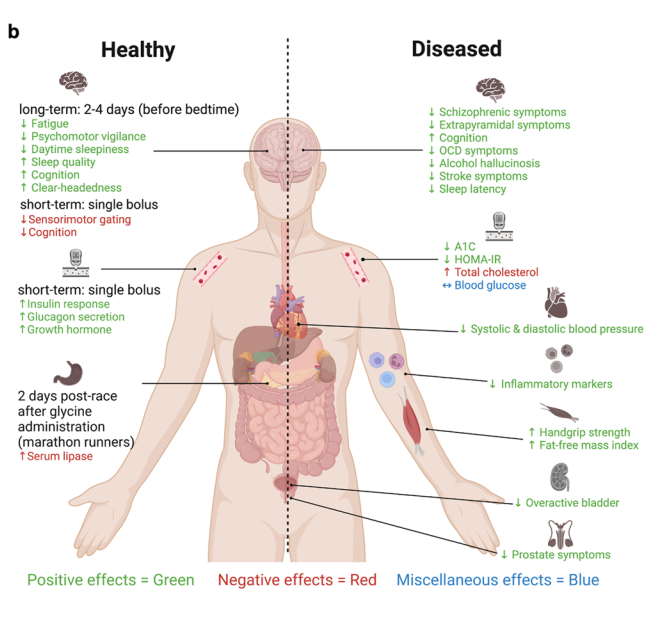 Quelle: The effect of glycine administration on the characteristics of physiological systems in human adults: A systematic review, Andrea B. Maier et al.,2024, DOI: 10.1007/s11357-023-00970-8