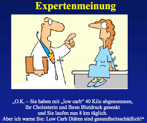Und wenn Sie jetzt noch das korrekte "no carb" einsetzen, dürfte der Experte wohl noch "besser" Bescheid wissen. Auch in der Medizin gilt die allgemein menschliche Erfahrung: Von Fakten lasse ich mir mein Weltbild noch lange nicht verbiegen!