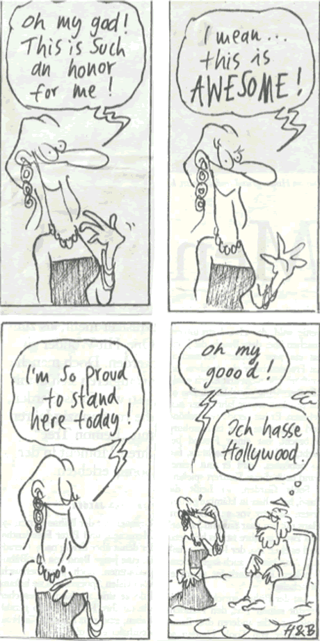 Anbei vier Zeichnungen. Sie kennen den Oscar? Die Preisverleihung in Hollywood? Mit den stereotypen Auftritten der Stars? Immer die gleichen Worte? Kennen Sie? Na, dann lernen Sie bitte, wie auch unser Herrgott dran leidet. Na los: