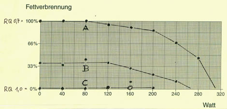 Sie sehen drei verschiedene Menschen: Die unterste gerade Linie (C) zeigt zwei Drittel der Deutschen. Schon in Ruhe Null Fettverbrennung, unter Belastung dann natürlich auch. Die verbrennen nur Zucker. Immer. Das Fett klebt woanders...