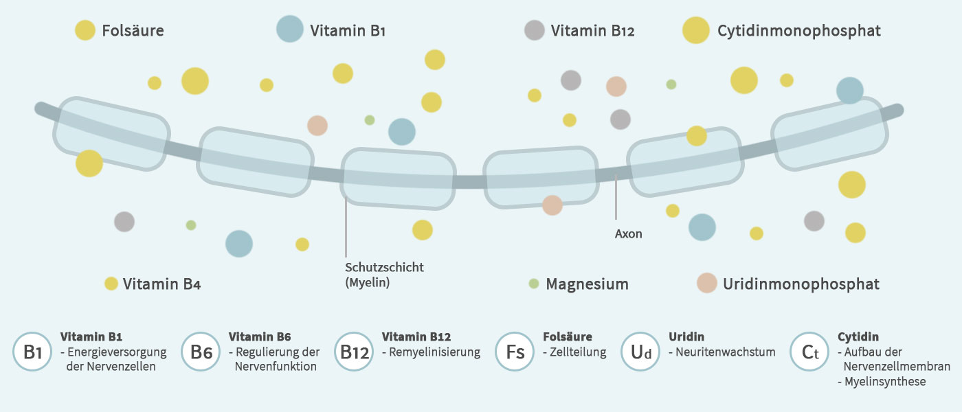 Studien der vergangenen Jahrzehnte konnten zeigen, dass insbesondere die B-Vitamine, nämlich Vitamin B 1, Vitamin B 6, Vitamin B 12 und Folsäure sowie der Mineralstoff Magnesium die normale Funktion und den Regenerationsprozess von Nerven unterstützen können.