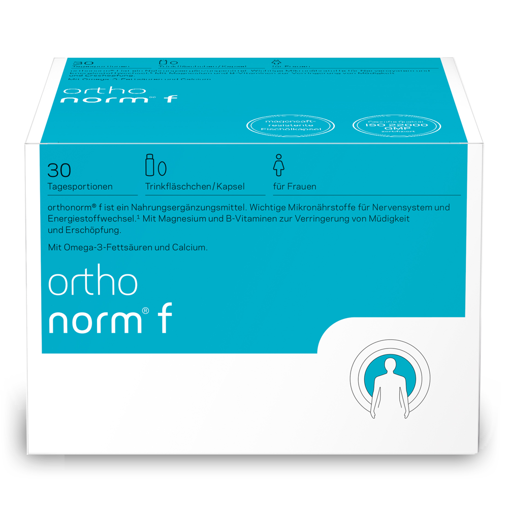 orthonorm® f ist ein Nahrungsergänzungsmittel. Wichtige Mikronährstoffe für Nervensystem und Energiestoffwechsel. Mit Magnesium und B-Vitaminen zur Verringerung von Müdigkeit und Erschöpfung. Mit Omega-3-Fettsäuren und Calcium.