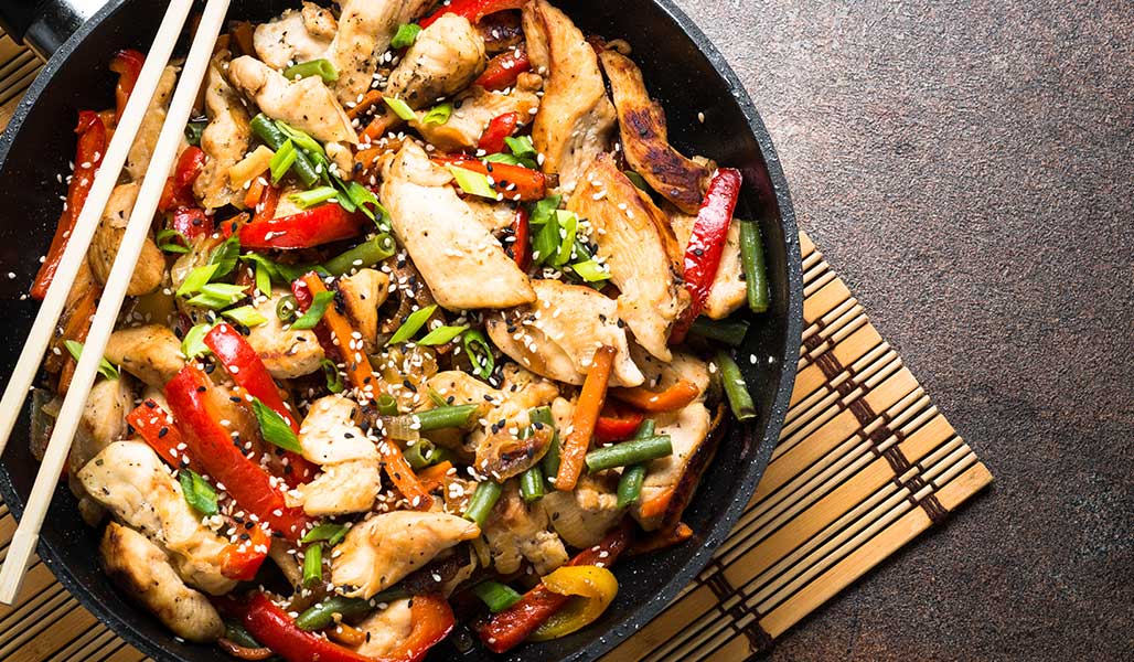 Die Gurken putzen, schälen, längs halbieren, mit einem Teelöffel entkernen und quer in etwa 1 cm breite Scheiben schneiden. Den Staudensellerie waschen, putzen und schräg in dünne Scheiben schneiden. Die Paprikaschoten putzen, vierteln, entkernen, waschen und in feine Streifen schneiden. Schalotten abziehen, halbieren und in feine Halbringe schneiden. Limetten heiß waschen, abtrocknen, die Schale fein abreiben, den Limettensaft auspressen. Das Hähnchenfilet abbrausen, trocken tupfen und die Macadamianüsse grob hacken und in einer kleinen Pfanne ohne Fett goldbraun rösten. Vom Herd nehmen und abkühlen lassen. Inzwischen im Wok oder in einer großen Pfanne 1 EL Öl erhitzen, die Hähnchenstreifen darin in zwei Portionen bei mittlerer bis starker Hitze 2-3 Minuten unter Wenden anbraten. Fleisch herausnehmen, auf einen Teller geben, salzen und mit dem Limettenabrieb mischen.