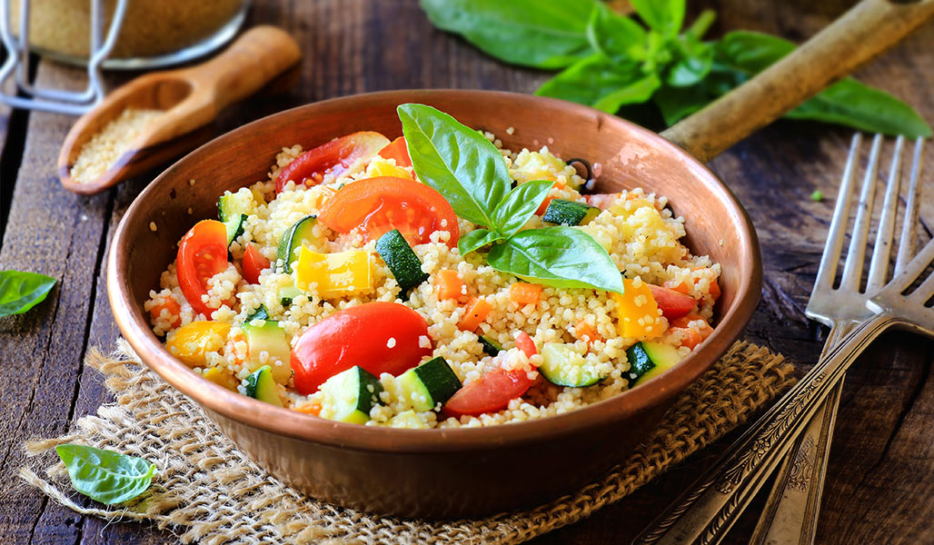 - Den Bulgur und 100ml Brühe in einen Topf geben, Kurkuma zufügen und etwa 5 Minuten kochen, dann 5 Minuten quellen lassen.