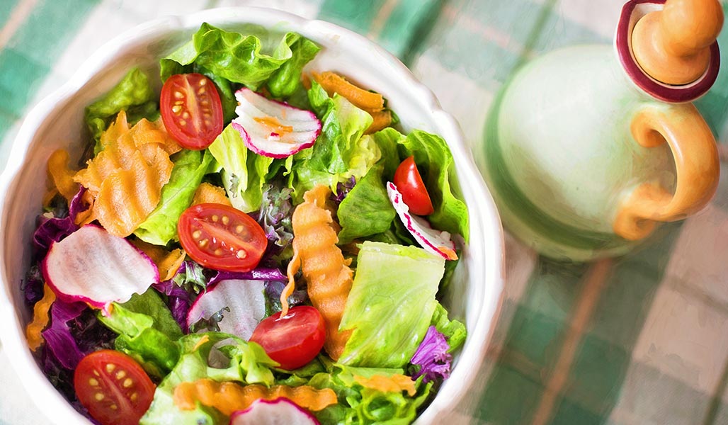 Die Salate waschen, trocken schleudern, putzen, verlesen und in mundgerechte Stücke zupfen. Die Tomaten waschen und vierteln, die Gurken waschen, abtrocknen, längs halbieren, dann quer in Scheiben schneiden. Die Paprikaschoten halbieren, putzen, waschen und in sehr kleine Würfel schneiden. Die Frühlingszwiebeln und Radieschen waschen, putzen und in dünne Scheiben schneiden. Alle Blattsalate und Gemüsezutaten in einer großen Schüssel locker mischen.