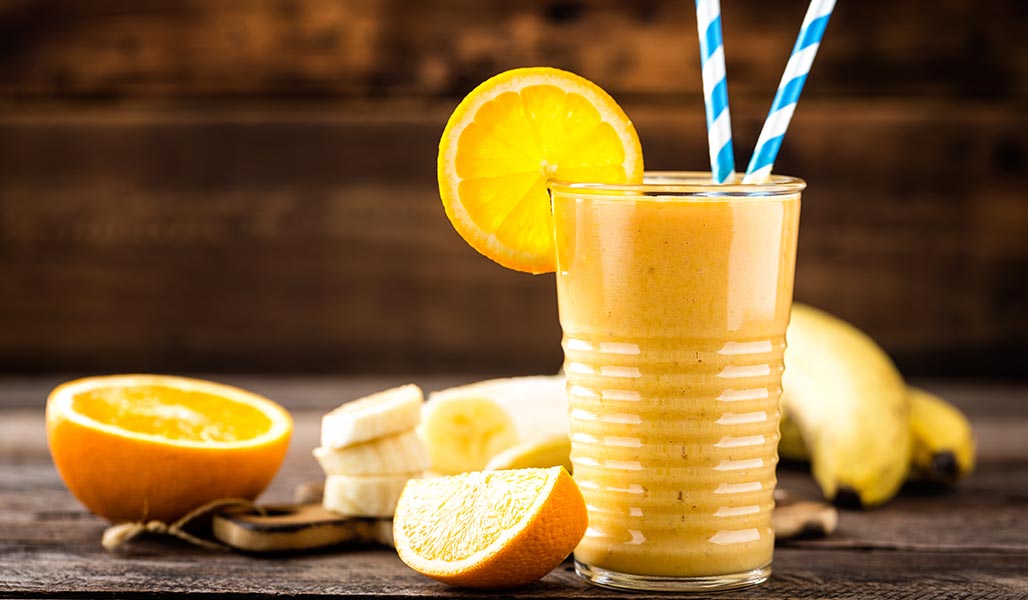 Drink in ein Cocktail-Glas füllen und fertig ist der gut sättigende und fruchtige Orange-Ingwer-Drink, ein Genuss!