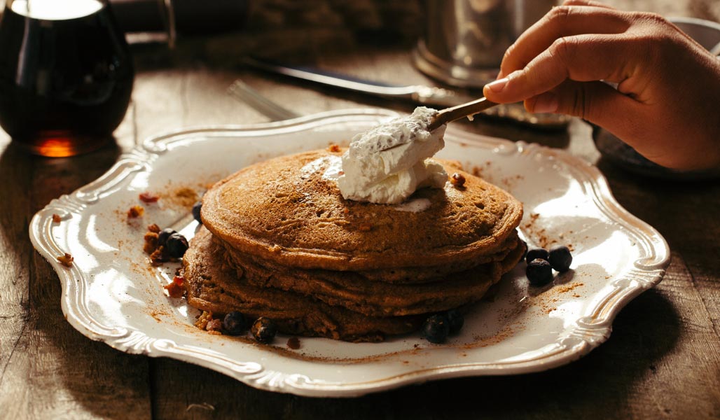 In einer großen Pfanne je 1 TL Butter und Öl erhitzen. Die Hälfte des Teigs esslöffelweise hineingeben und bei mittlerer Hitze etwa 2 Minuten backen. Sobald die Oberfläche gestockt ist, die Pancakes wenden und für 2 – 3 Minuten weiterbacken. Fertige Pancakes auf einem Teller im Backofen bei 100 Grad warm halten. Pancakes so lange backen bis der Teig leer ist.