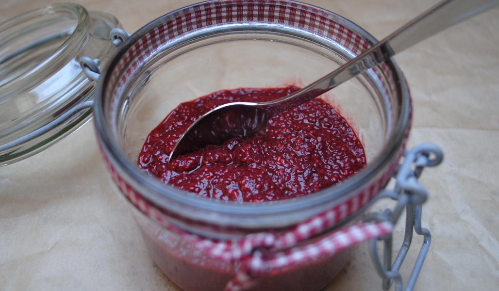 Himbeeren abkühlen lassen und die Chia-Samen, das Vitamineral 32 und Erythrit einrühren. Klümpchen vermeiden. Es ist wichtig das die Himbeeren wieder abgekühlt sind um die wertvollen Inhaltsstoffe der Chia-Samen und des Vitamineral 32 zu erhalten.