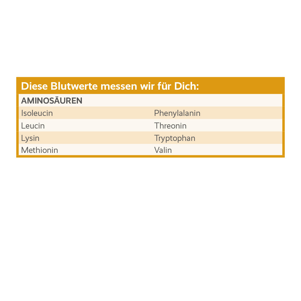 Um eine optimale Grundlage für Gesundheit und Wohlbefinden zu schaffen, ist eine ausreichende Versorgung mit den acht essentiellen Aminosäuren ratsam. Wagen Sie deshalb mit dem for you aminogramm essential einen Blick in die Welt des Bluttunings. Anschließend können Sie mit dem großen for you aminogramm zusätzlich 17 weitere Aminosäuren im Trockenblut bestimmen.