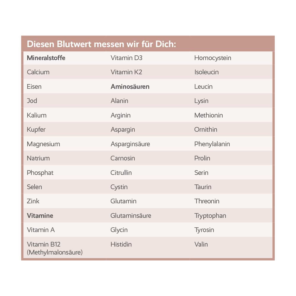 - Analyse von 25 Aminosäuren, 10 Mineralstoffen und 4 Vitaminen