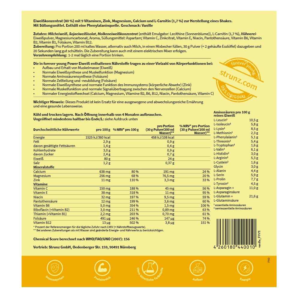 Das forever young Power Eiweiß ist ein hochwertiges, multifunktionelles Eiweiß-Konzentrat. Die Vanille Proteinpulver-Mischung aus vier verschiedenen, biologisch hochwertigen Proteinquellen ist gut löslich, fettarm und wohlschmeckend. Auf den Geschmack legen wir besonders großen Wert. Die Rezeptur wurde über die Jahre geschmacklich so verbessert und weiterentwickelt, dass das Vanille Proteinpulver angenehm leicht und doch deutlich nach Vanille schmeckt. Traditionell steht forever young Power Eiweiß für guten Geschmack, ein vollständiges Aminosäuren-Spektrum und einen hohen Chemical Score.